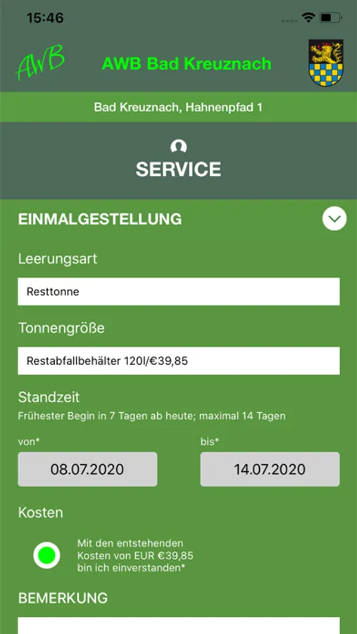 Beim Start der App, Ihre Abfuhradresse angeben und los geht's!