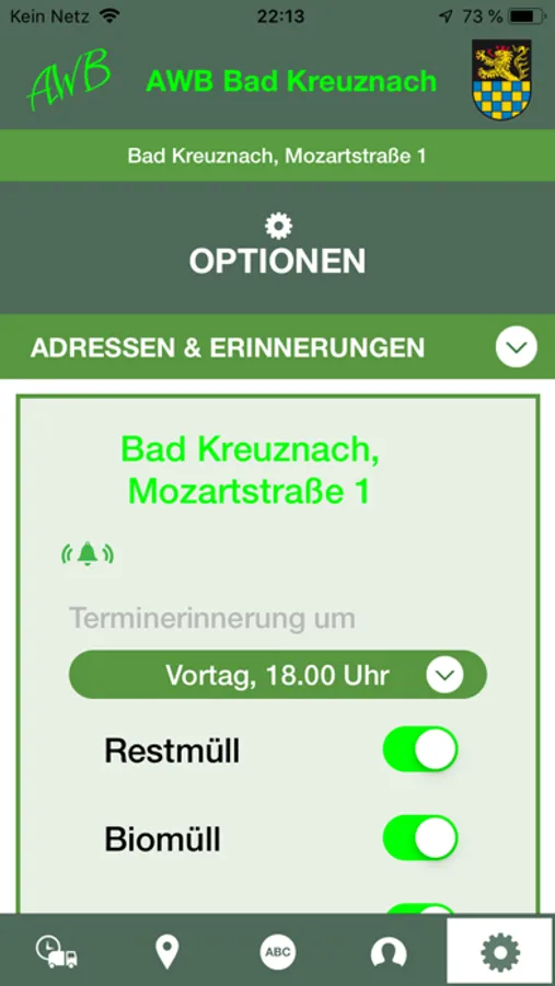 In den Optionen werden die Adressdaten hinterlegt, sowie die Erinnerungen der einzelnen Mülltermine gesteuert. Die Adressdaten können sowohl per Tastatureingabe, als auch mittels Abfrage der GPS Koordinaten erfasst werden. Es besteht die Möglichkeit, mehrere Adressen zu hinterlegen. Die Terminerinnerungen können für jede Leerungsart separat festgelegt werden: Restabfall, Bioabfall, Wertstoff-, Altpapier- und Schadstoffsammlung. Die Erinnerung zum persönlichen Sperrmülltermin ist ebenfalls hier definierbar.