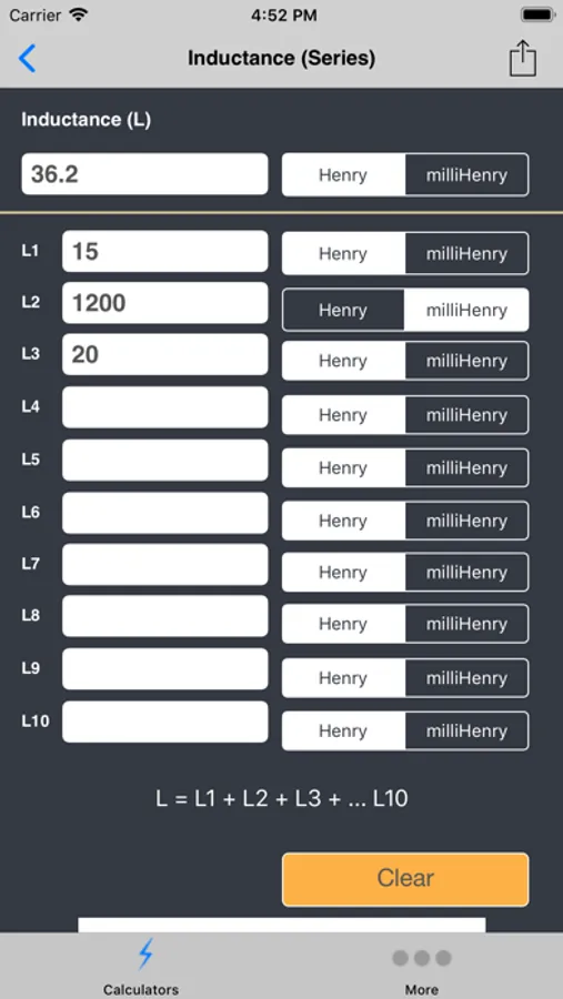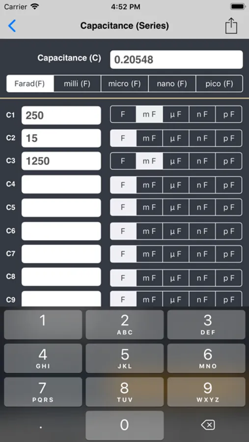 For Capacitance Series inputs can be made in Farad, milli-Farad, micro-Farad, nano-Farad and pico-Farad. Very useful App for Electrical Engineers and Electrical Students.