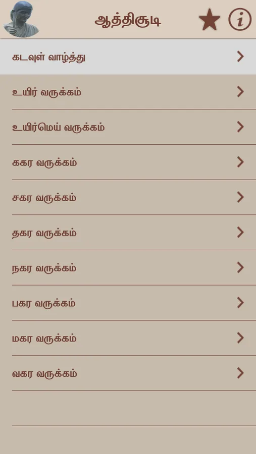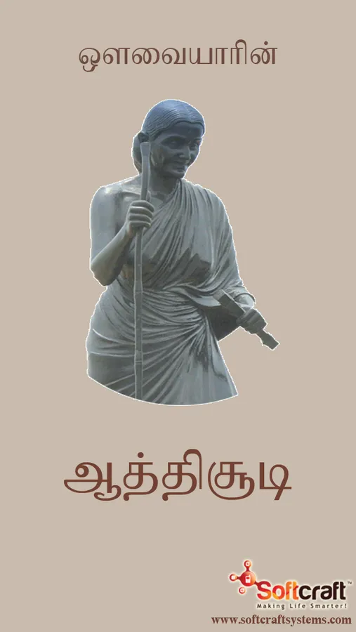 Aathichoodi is a collection of single-line quotations written by Magaan Avvaiyar and organized in alphabetical order. There are 108 of these sacred lines. The expressions in the lines of Aathichoodi are intended to address everyday problems. It teaches good habits,discipline and good works for all.