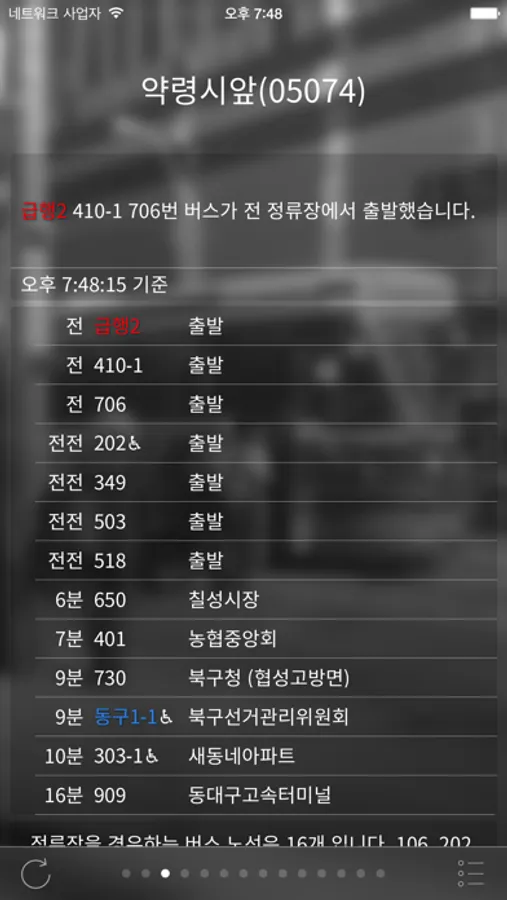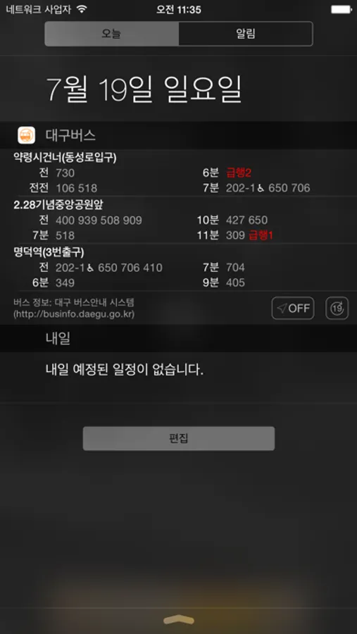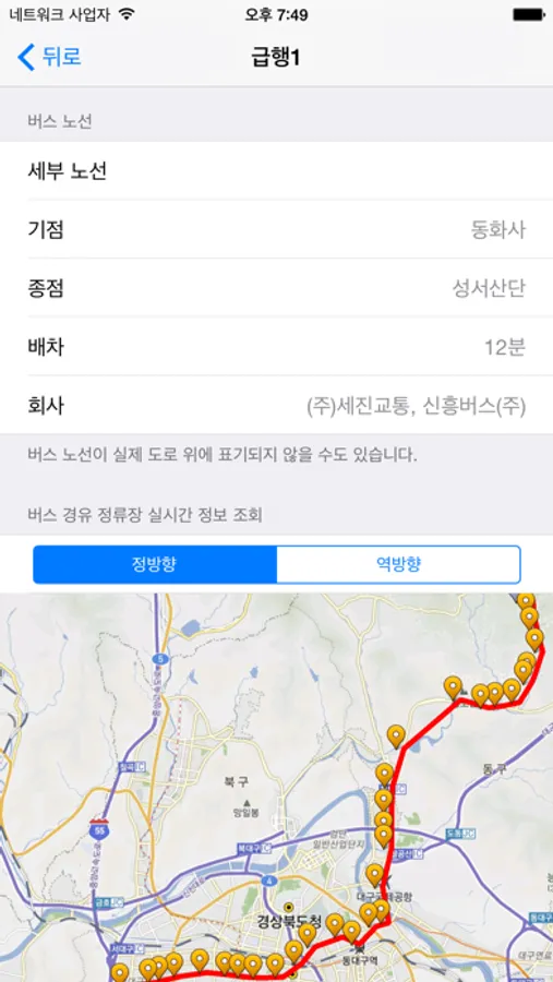 시내버스 정보는 대구광역시 버스노선안내시스템 홈페이지(businfo.daegu.go.kr)에서 가져옵니다. 홈페이지의 상태에 따라 정보가 안내되지 않을 수 있습니다.