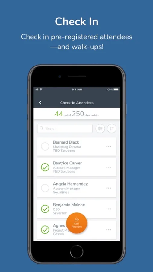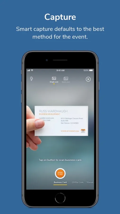Capture: Scan business cards and badges, check in pre-registered attendees, or add manually.
