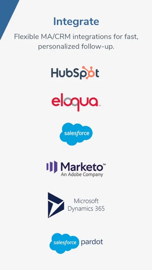 Follow Up: Send captured lead data to your Marketing Automation and CRM systems for fast, personalized follow up.