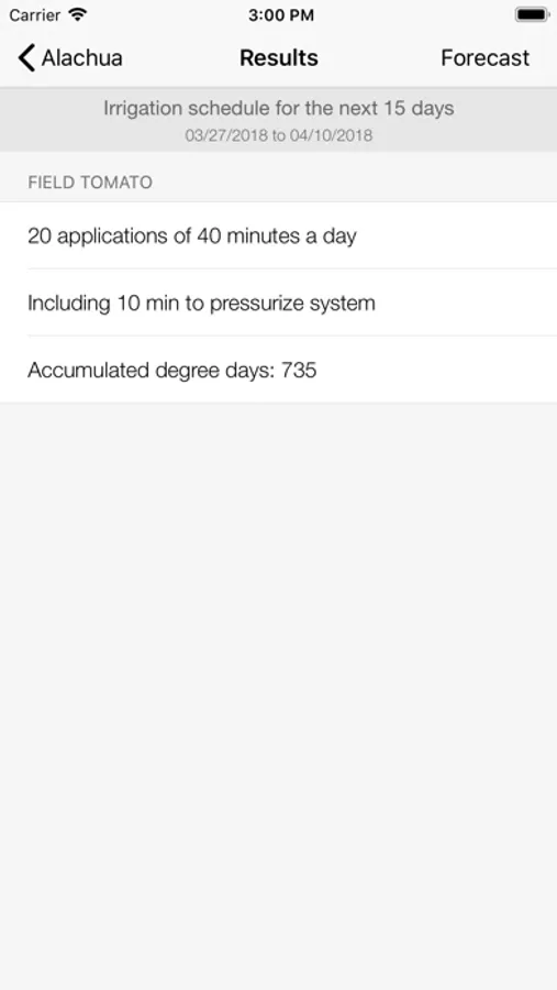This app is designed to help vegetable growers in Florida and Georgia, USA to generate irrigation schedule recommendations based on real-time weather and short-term forecasted data to better meet the plant water needs of a given period, conserving water while also minimizing nutrient leaching from the root zone due to excessive irrigation.