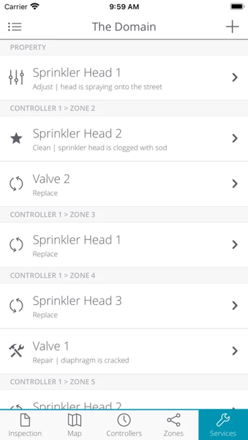 • Identify all services to be performed against irrigation assets for a property