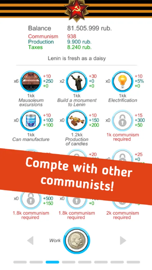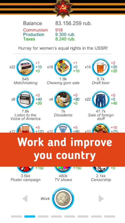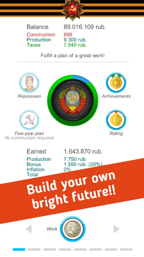 USSR Simulator - upgrade communism and build your own bright future! Imagine yourself as a Soviet official - develop your country, collect taxes, fulfill 5-year plans and fight against enemy of the people by means of repressions!