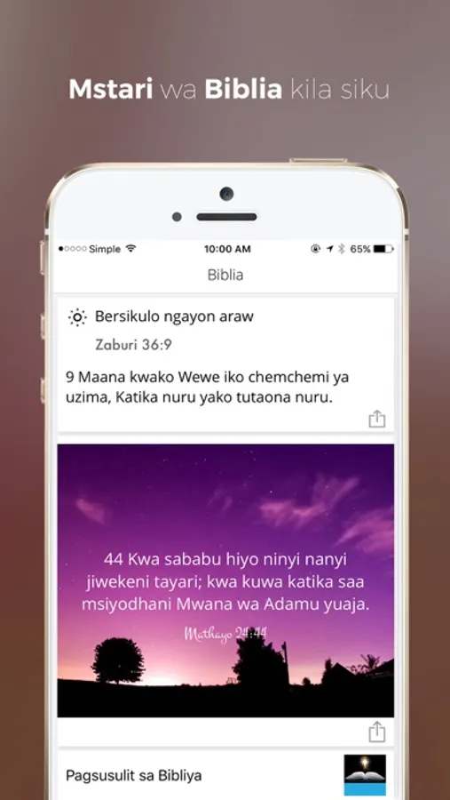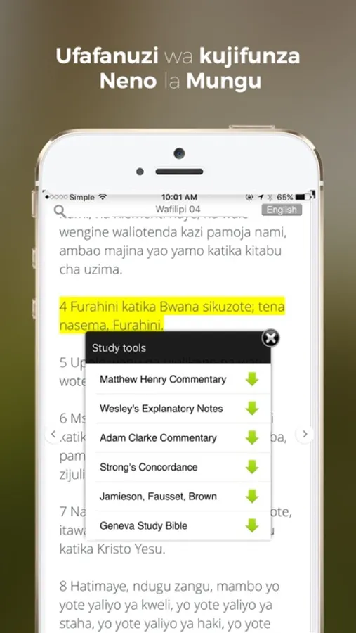 Swahili Bible is the Swahili Union Version (SUV) Bible version for your iPhone, ipad and iPod. Offered with KJV English Bible, utilizing the power of apple device for Kiswahili speaking community.