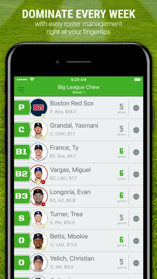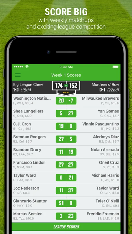 Using a salary cap of $100 Million, pick a team of 8 pro baseball players, a utility position and a pitching staff that you think will score the most points each week using the unique Head-2-Head scoring system.