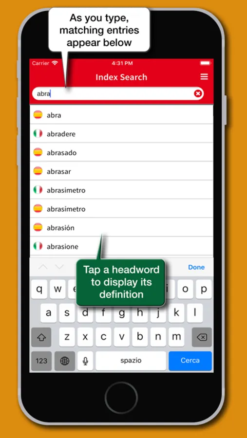 • Index search: displays in alphabetical order the headwords that match the characters typed in the search box