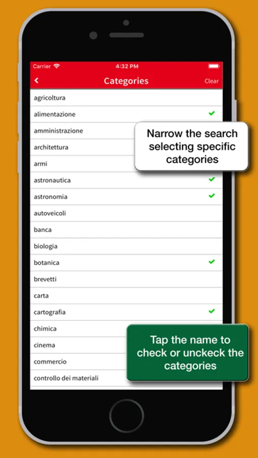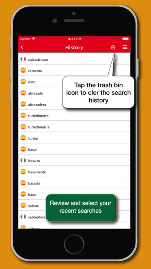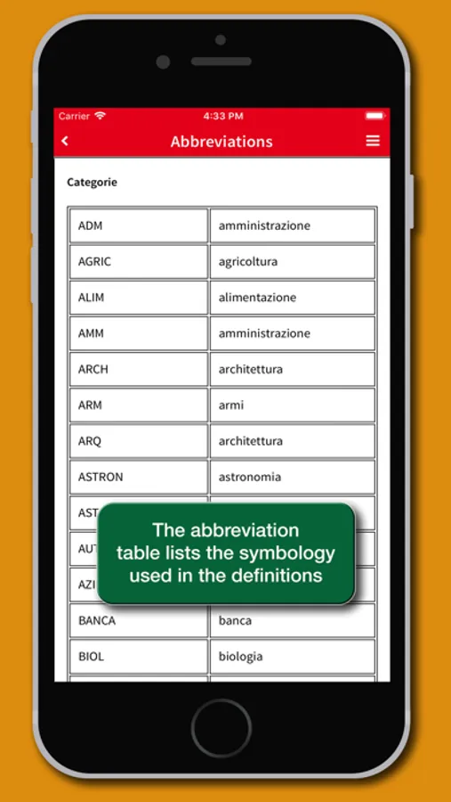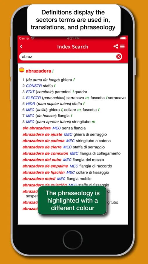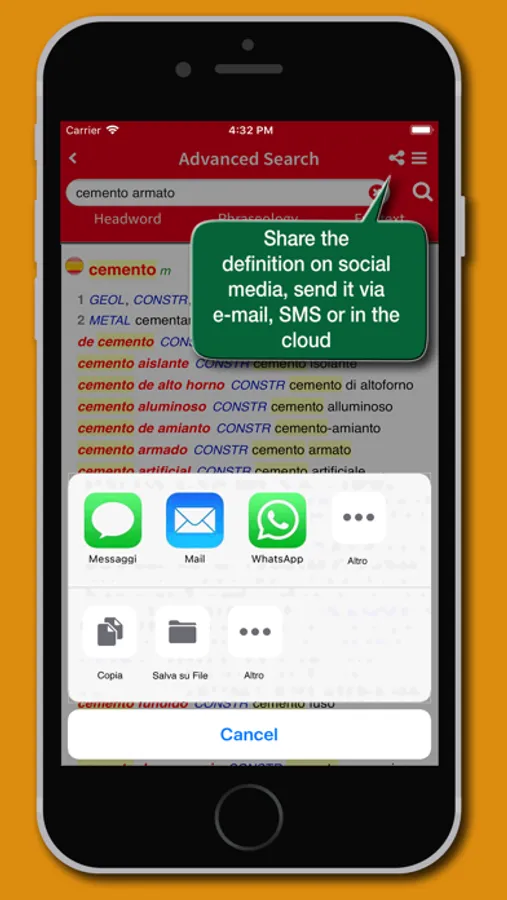 The app's interface has been redesigned to provide a simpler and more intuitive experience. Each definition can be shared using the features available in the device, such as social media, e-mail, SMS, cloud. A main menu that can be activated via an icon available at the top right of the screen enables all the features of the app:
