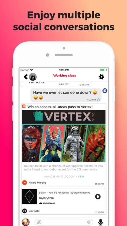 Exchange photos, videos, audio recordings, choose between hundreds of stickers available through GIPHY and enjoy embedded contents directly available without leaving the app.