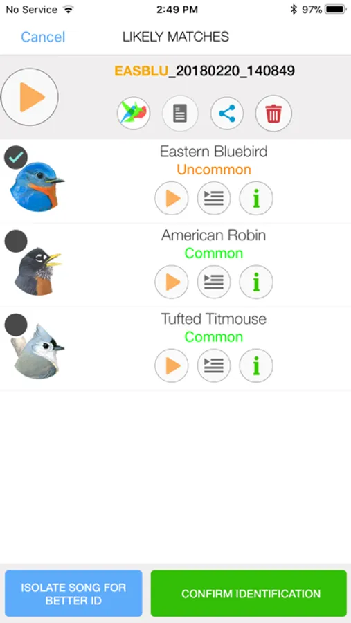 -It is ideal to get a recording of a single bird singing. The app can be confused by noise or background birds but tools are provided to trim and filter your recordings to improve the results.