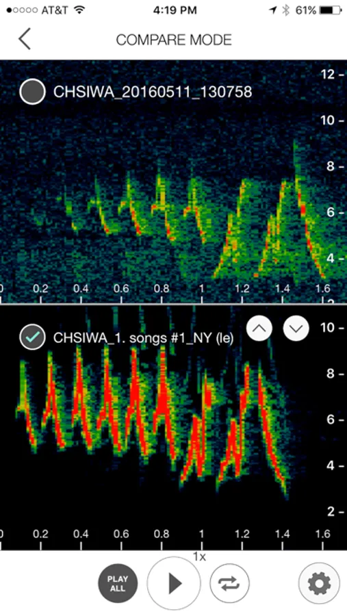Simply press the record button when you hear a bird singing and the app begins recording a few seconds back in time using the built-in microphone. Tap the record button again when the song is complete and Song Sleuth immediately shows you three most likely species. To assist you in determining the correct bird, you can listen to your recording and the example recordings of the likely matches as well as compare their spectrograms side-by-side.