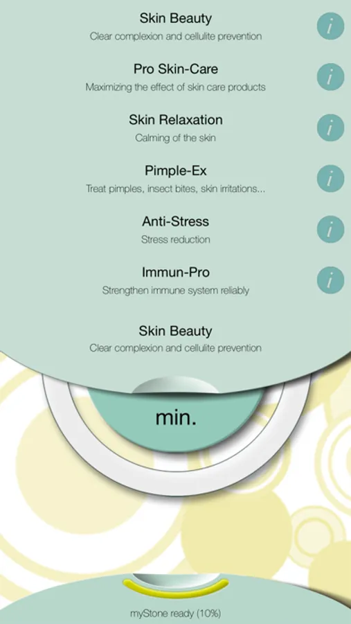 myStone is an app, that activates 6 beauty-applications on a myStone over Bluetooth-LE. You can choose between Skin Beauty, Pro Skin-Care, Skin Relaxation, Pimple Ex, Anti-Stress, Immun-Pro and Anti-Stress programs.
