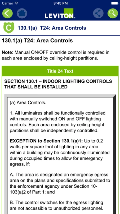 The Leviton Title 20 & 24 app simplifies California Title 20 & 24 2013 lighting controls code requirements. This powerful app organizes Title 20 and Title 24 information and makes it easily accessible and readily available with a simple swipe on your smart device. Search by application, code language and recommended Leviton solutions to get inspiration for designing code compliant applications. Examples include residential indoor, residential outdoor, classrooms, offices, retail and restaurant spaces. View diagrams and summaries of the code requirements met for recommended solutions. You will also be able to access videos and other design tools like our easy to follow Title 20 Line Card, Title 24 Design Guide and exclusive Code Assist Services.