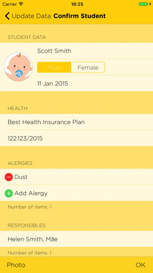* Data: enter the most important data about your kids. What are their allergies? Do they have a health insurance plan? Who is authorized to pick them up? What are their birthdays?