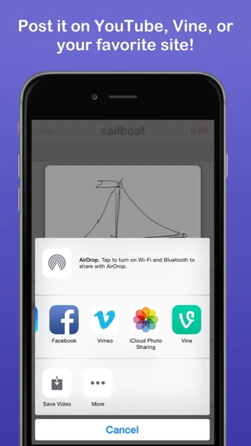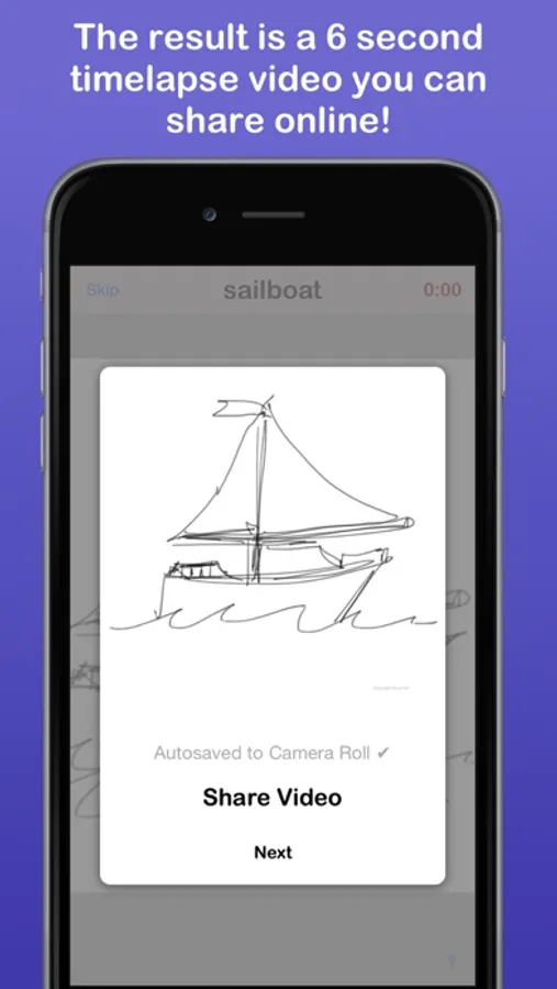 Instead of just a picture, Doodletime saves a cool timelapse video of your doodle. Share them on Facebook, Youtube, Vine, or your favorite site from the camera roll or 3rd party App.