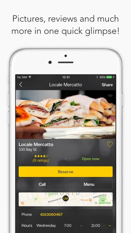 • Access restaurant details including menus, photos, address, phone number, opening hours, maps, user reviews, and more.