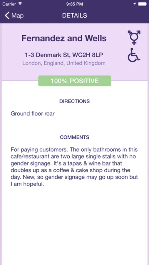 - Tap a map pin to see more information about a restroom, including whether the restroom is unisex and/or accessible.