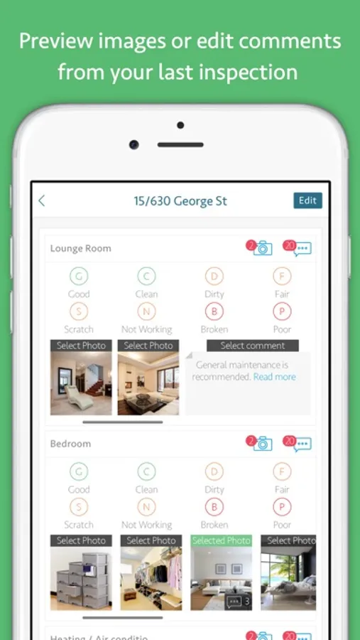 - Last Inspection Data – why do the work again? Pull through previous inspection data, saving time onsite. Particularly useful from ingoing to outgoing and outgoing to ingoing.