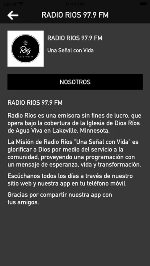 Radio Ríos es una emisora sin fines de lucro, que opera bajo la cobertura de la Iglesia de Dios Ríos de Agua Viva en Lakeville, Minnesota. Transmitiendo las 24 horas online en RadioRiosFM.com. La Misión de Radio Ríos ‘Una Señal con Vida’ es glorificar a Dios por medio del servicio a la comunidad, proveyendo una programación con mensajes educativos que promueven los valores espirituales, morales y sociales del pueblo de habla hispana.