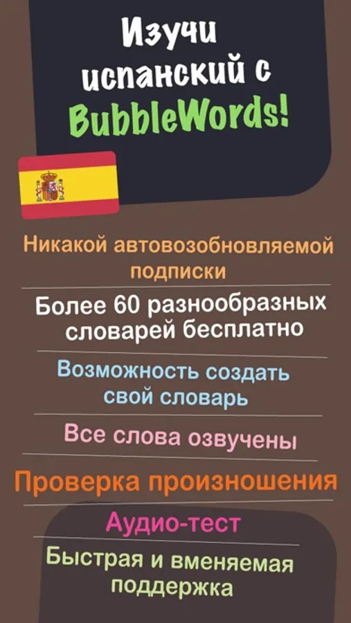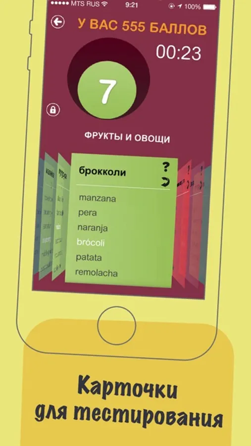 Обучение испанскому языку реализовано в виде карточек по любому из словарей.