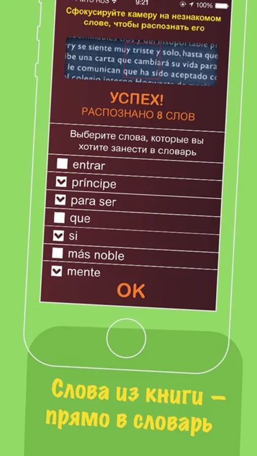 • Добавление незнакомых слов с помощью фотокамеры. Сфотографируйте слово, приложение распознает его и добавит в словарь;