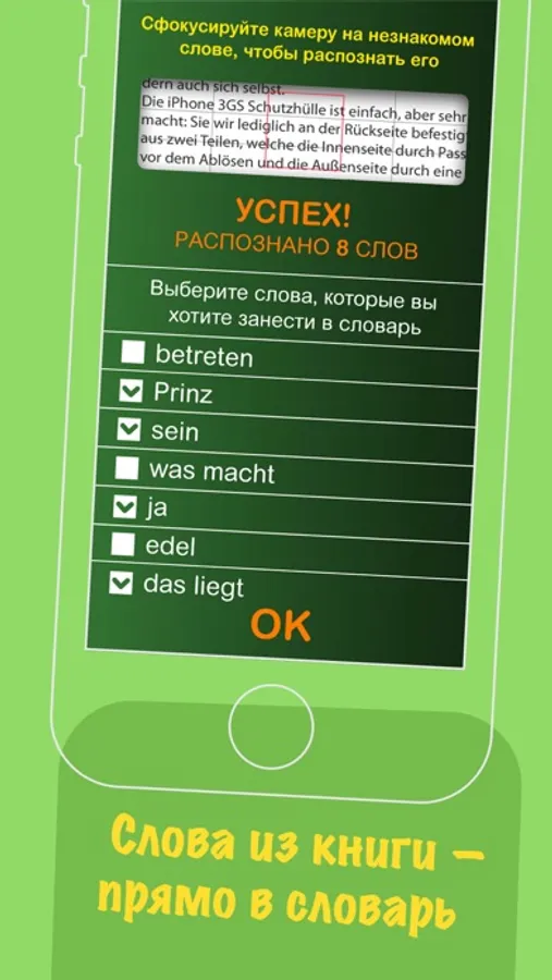 • Добавление незнакомых слов с помощью фотокамеры. Сфотографируйте слово, приложение распознает его и добавит в словарь;