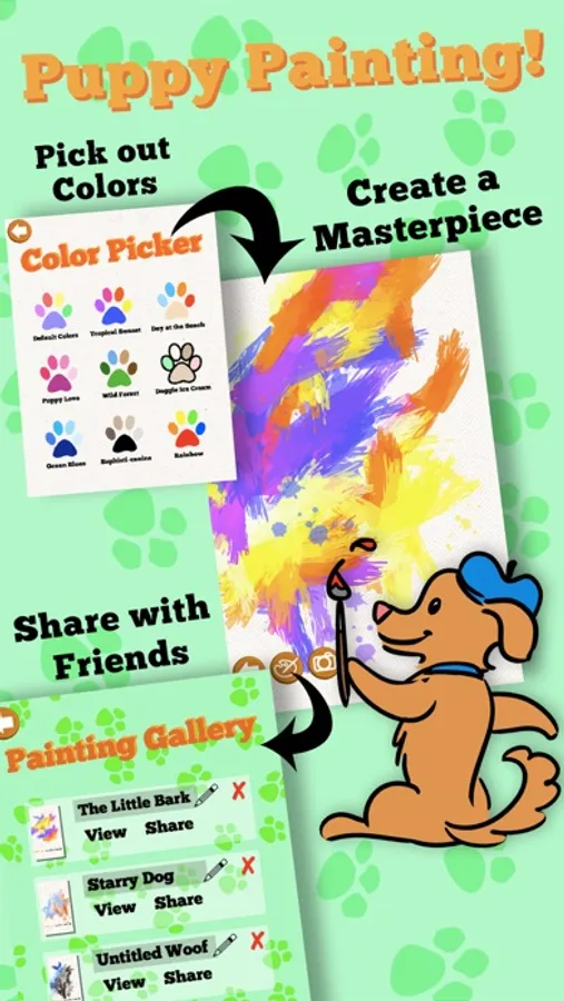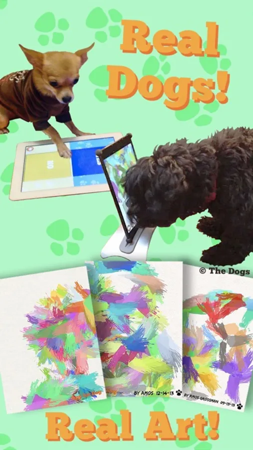 A new painting gallery feature lets you save, view and name multiple paintings. Save paintings to your device’s photo album, share them via Facebook and Twitter or email them to friends and family so everyone can see your dog’s original artwork!