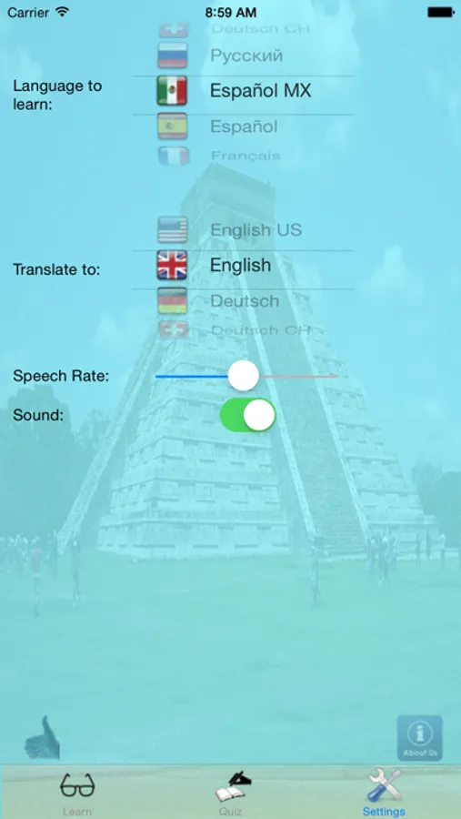 • 1500+ words with pictures and pronunciation in 10 Languages (13 flavors/accents)