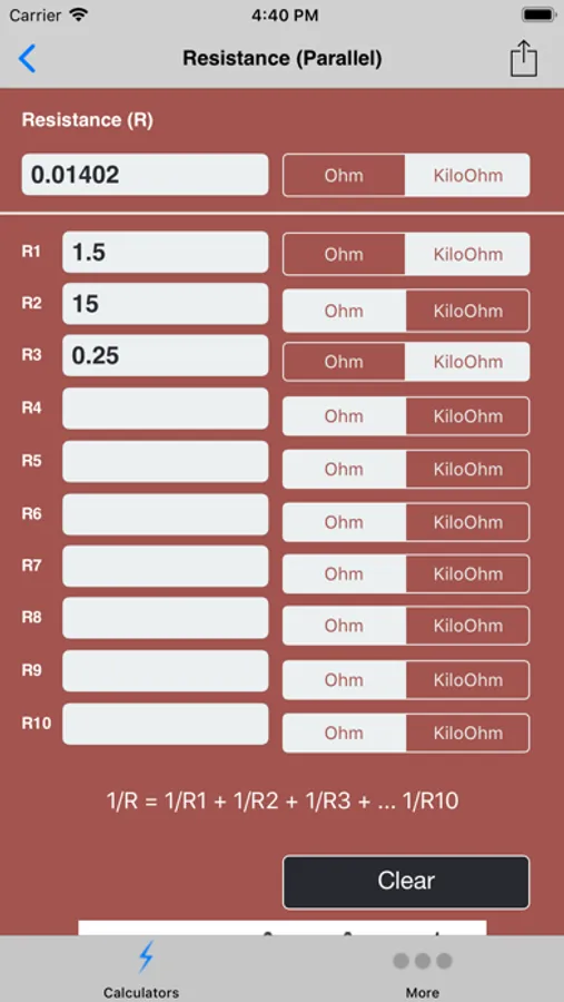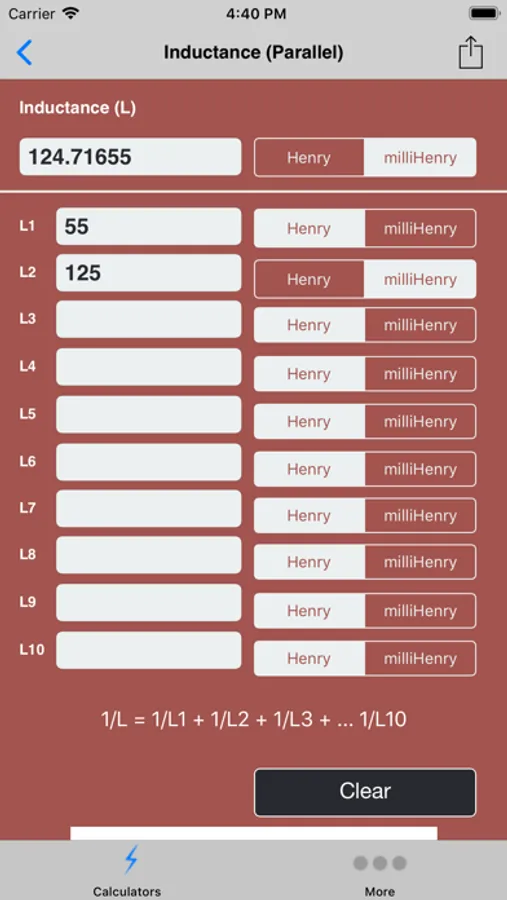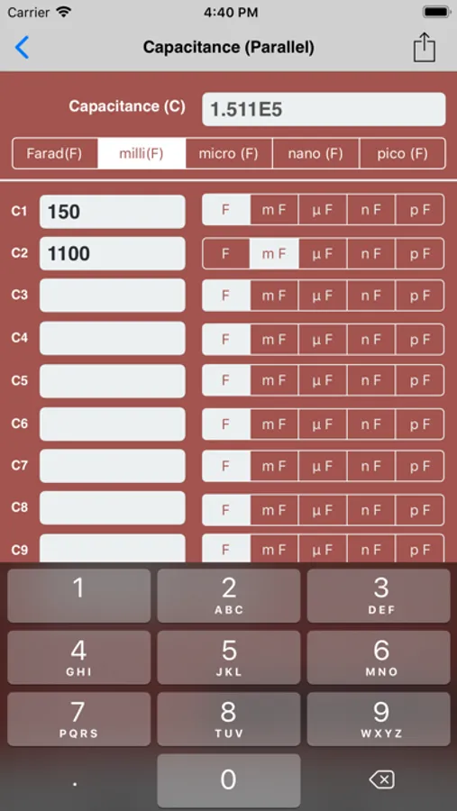 For Capacitance Parallel, inputs can be made in Farad, milli-Farad, micro-Farad, nano-Farad and pico-Farad. Very useful App for Electrical Engineers and Electrical Students.