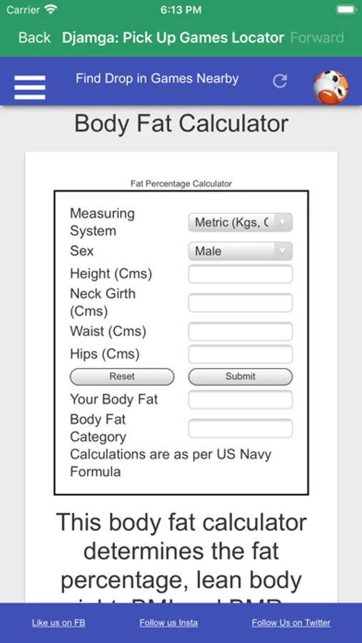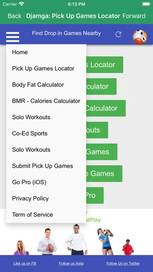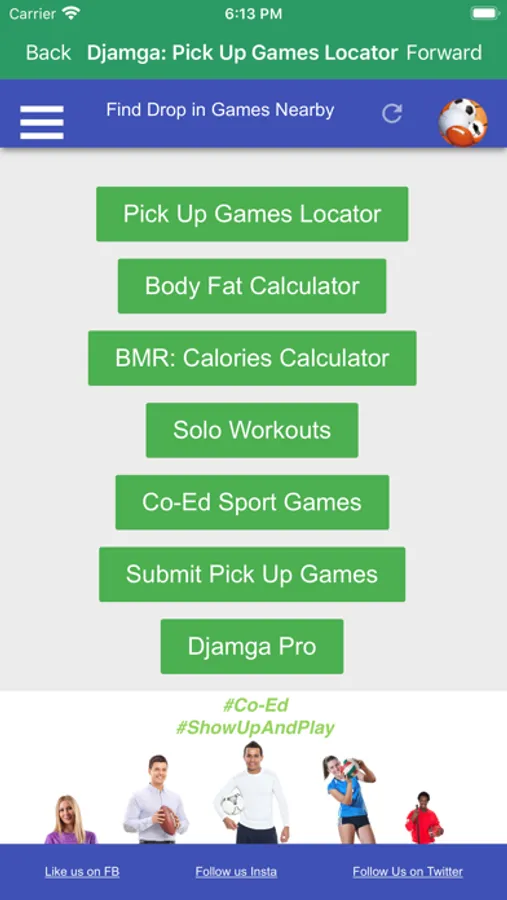 Our mission is to help everyone on the planet stay fit by using the Djamga App to calculate their BMI, BMR, Calories intake and also find pick up games (Soccer, Hockey, Football, Footy, Futbol, Pelada, Basketball, Volleyball, Shiny, Rugby, Cricket, Flag Football, Dodgeball, Badminton, etc.) anytime, anywhere with no strings attached.