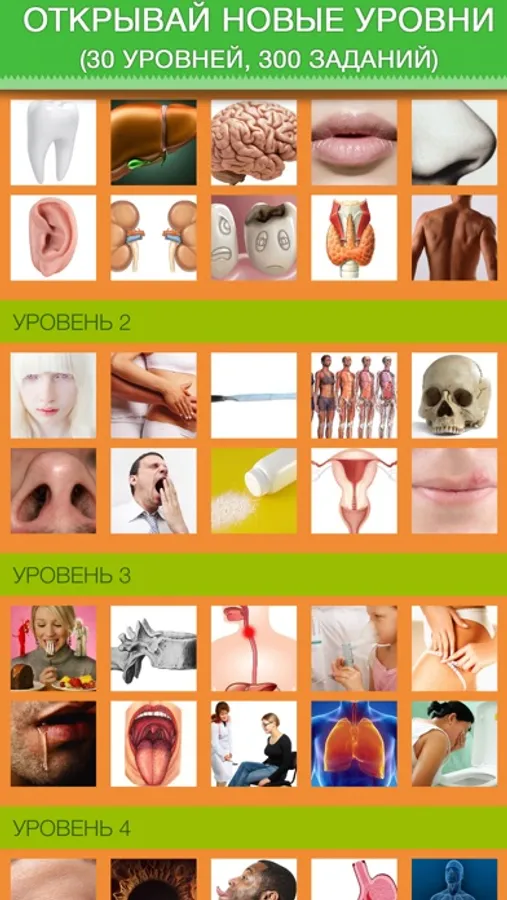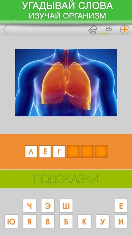Подставляйте буквы, отгадывая части тела и органы, болезни и паталогии, особенности строения человеческого организма - и становитесь лидером таблицы рекордов!
