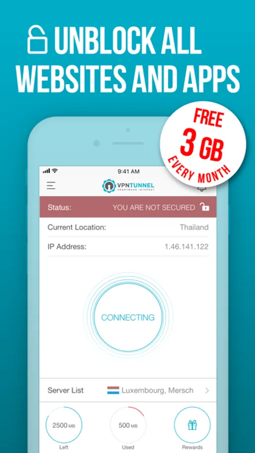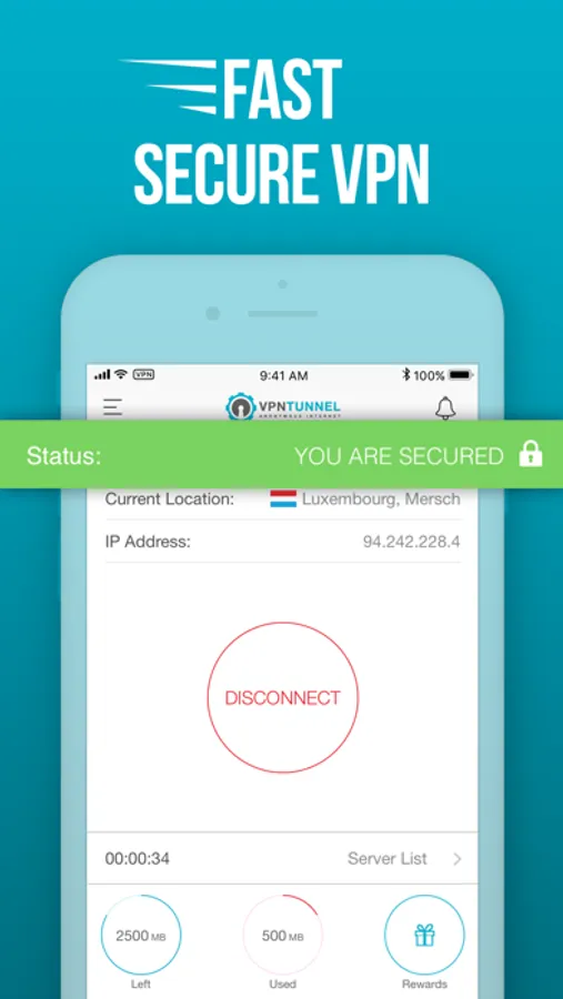 Mobile application VPNTunnel with intuitive interface is very easy in use. Download it from App Store, choose any location from the Server List and click the button “Connect”. Then, your IP will be changed, and all traffic will be secured. Also you will be able to view all information concerning your VPN connection: connection status, changed IP, location and used Mbs.