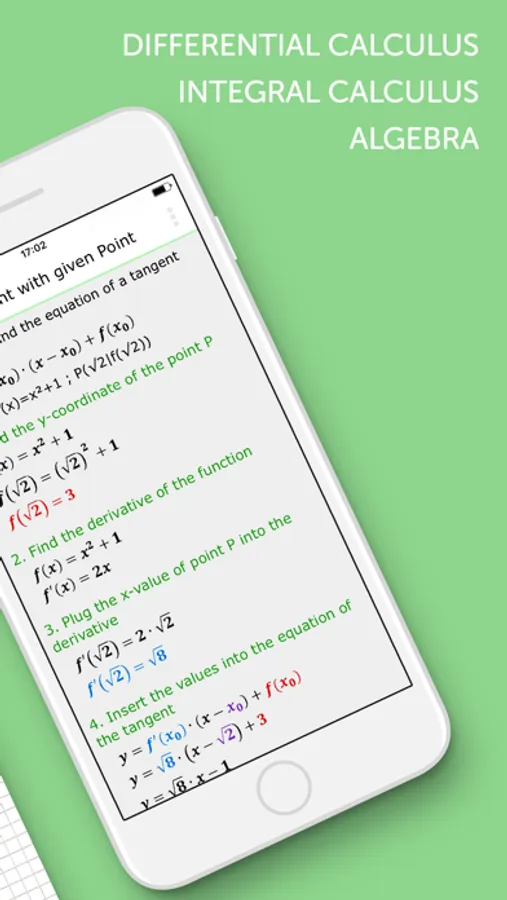 • This is the only app which shows you how to find the equations of tangent lines, inflection points and much more. Nearly all other math apps are only able to show you how to solve an equation.