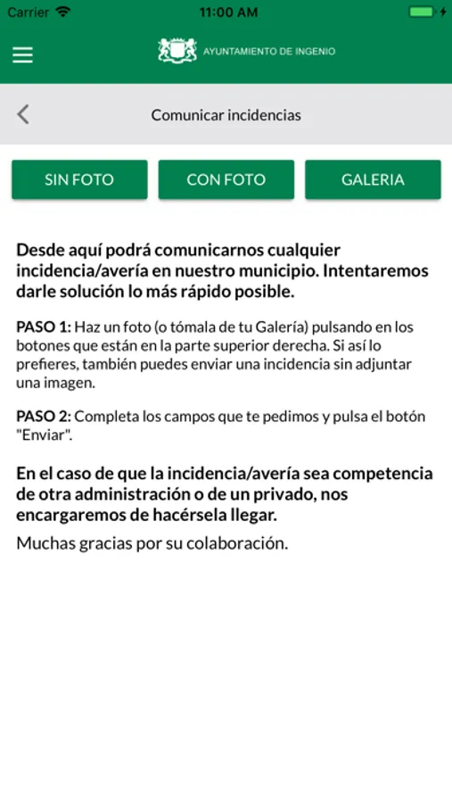 - Podrás comunicar cualquier incidencia, avería, desperfecto,etc en tu municipio con tan sólo hacer una foto y enviárnosla. Nosotros nos ocuparemos de todo lo demás!