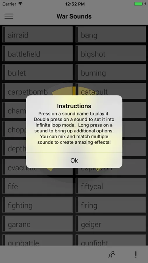 War sounds is a fun and free war sound effects soundboard app that features free high quality audio clips featuring weapons, guns, battles, planes, tanks, horses, and anything else related to war! You can play multiple sounds at once, or set them into infinite loop mode to create an authentic war scene. You can even share the sound clips on social media so that everybody can remember the glory days. With War Sounds, you can create realistic sounding battlefield recreations right from the palm of your hand! Hook it up to your sound system, and your neighbors will think that World War 3 has begun!