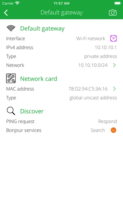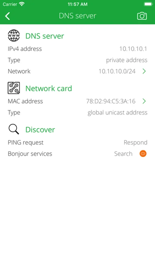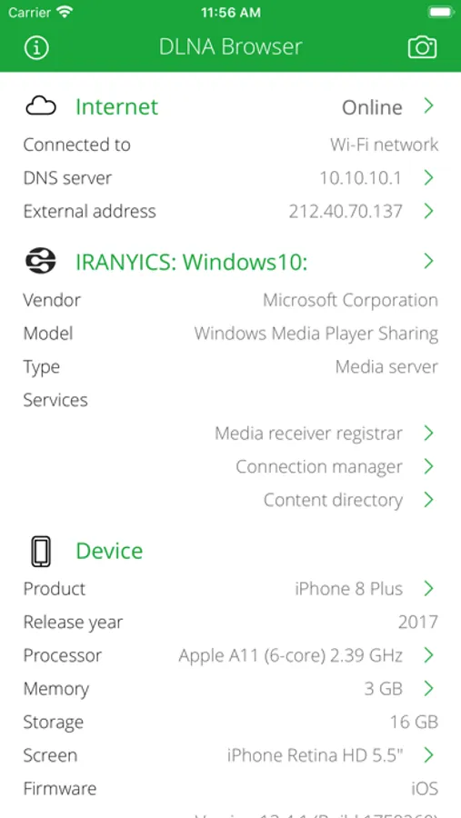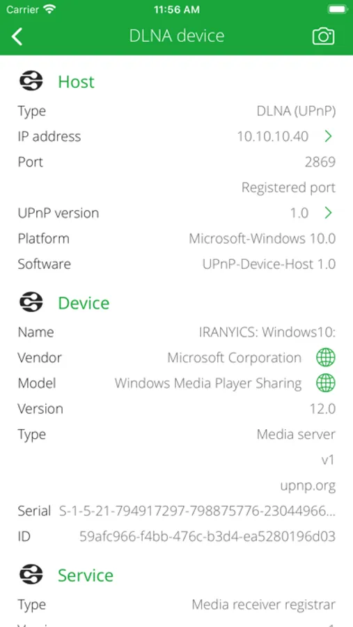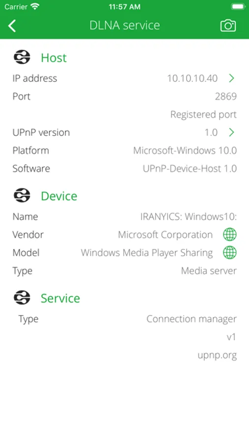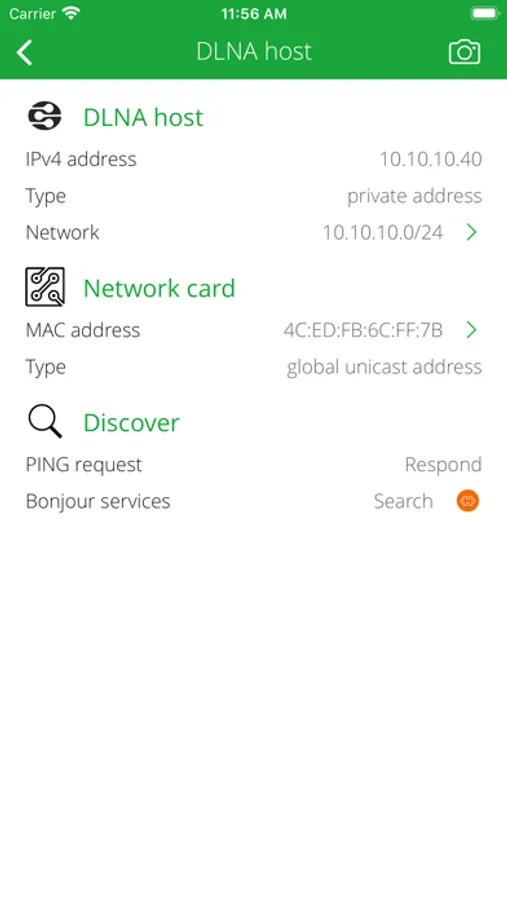 • Show DLNA host IP address, port number, UPnP version, local name, domain name, MAC address (with vendor information), PING capability.