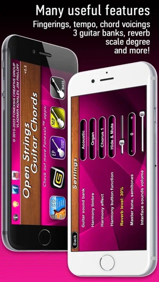 Open String Guitar Chords app is not only just a collection of chords (when "Slow" or "Fast" behavior selected), but it also shows their possible voicings (when "Auto" behavior selected). Both beginners and professionals can benefit from this app and take enough material for their music.