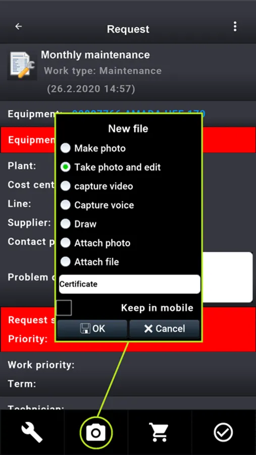 • Requests - repairs, maintenance, inspections, revisions, installations or other types of requests in one place. Easy tracking of failures, downtimes and the costs of repairs or maintenance. You can trace various stages for opened requests (waiting for a spare parts, waiting for a service company, analyzing the causes of failure etc.)