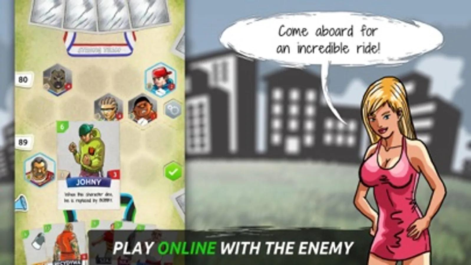 Unlike other card games, the field of battle and the location of every character on it is of great importance in our game. Selecting your crew (deck), you can create a unique scarf pattern identifying your gang. By winning consecutive melees you level up, which unlocks even stronger cards.