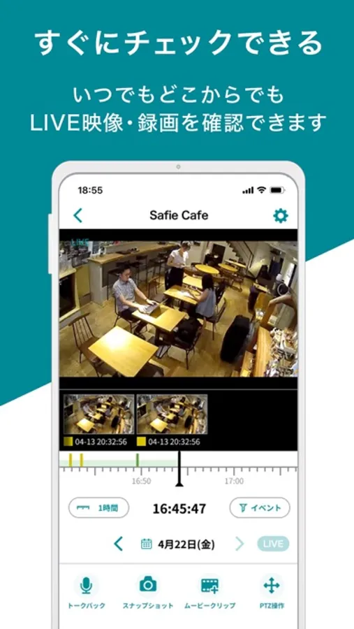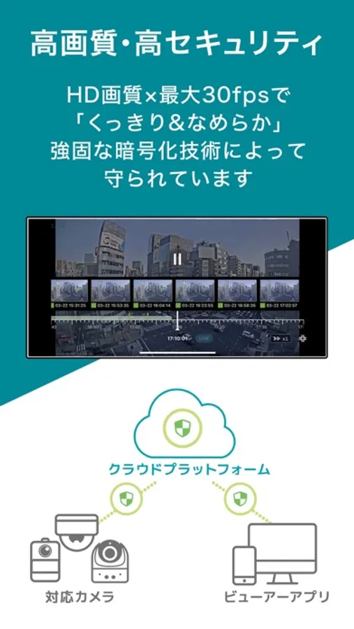 クラウドを通じて、高画質なリアルタイムの映像と録画された映像を手軽に見ることができます。