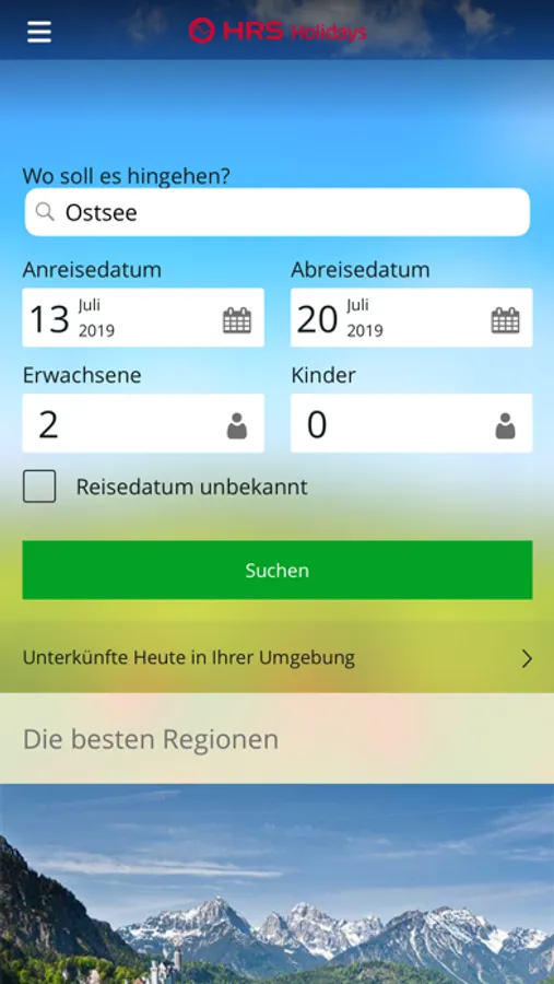 Haben Sie sich für Ihre Wunschunterkunft entschieden, sind Sie nur noch wenige Klicks von Ihrer Buchung entfernt. Über diese App sind alle verfügbaren Unterkünfte direkt zu dem angegeben Endpreis buchbar, ohne zusätzlich anfallende Buchungsgebühren und ohne lästiges Warten auf die Bestätigung durch den Gastgeber. Sie erhalten direkt eine Bestätigungsemail von HRS Holidays. Die Stornierung einer Buchung ist in den meisten Fällen kostenlos und die Bezahlung erfolgt meist erst bei der Anreise. Damit steht der risikofreien Urlaubsbuchung nichts mehr im Wege.