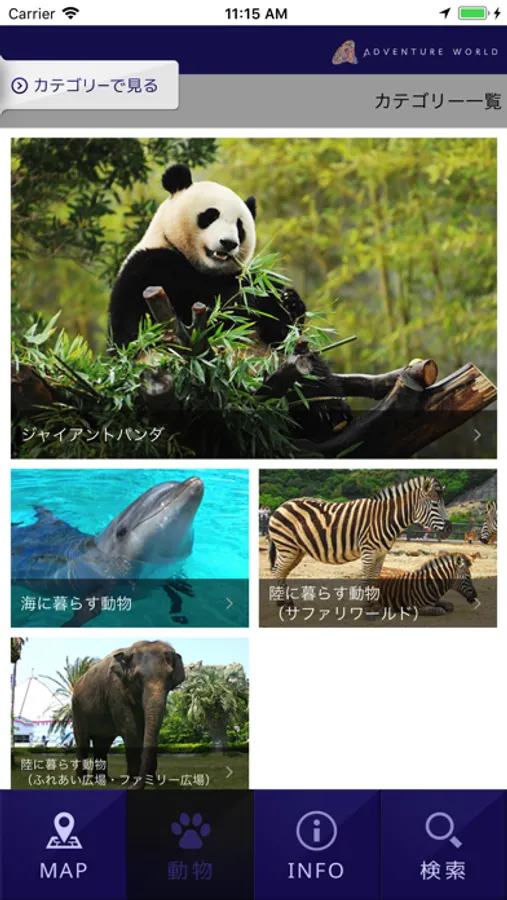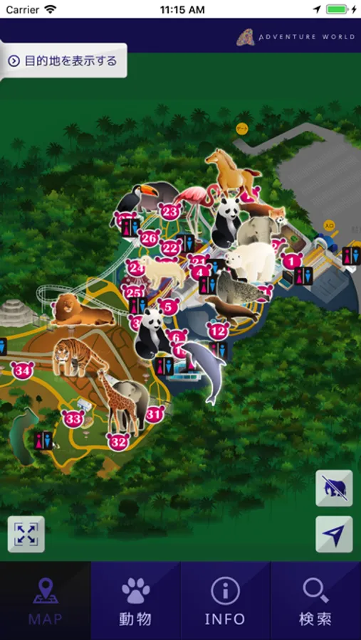 また、動物や施設、トイレ、レストラン、ショップなどの場所の検索が可能です。