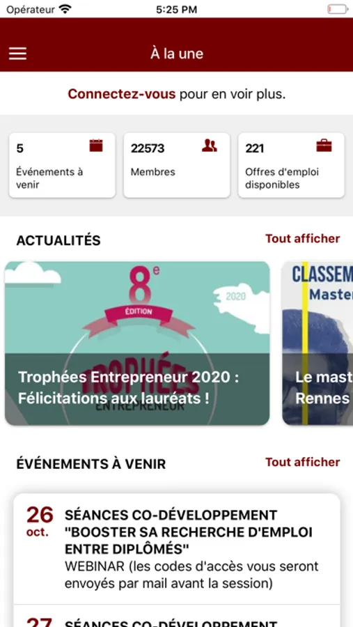 Elle vous permet d’accéder facilement aux principaux services présents sur notre site web : consultation de l’annuaire alumni et géolocalisation des membres, mise à jour de votre profil, accès à l’agenda des événements et aux offres d’emploi,…