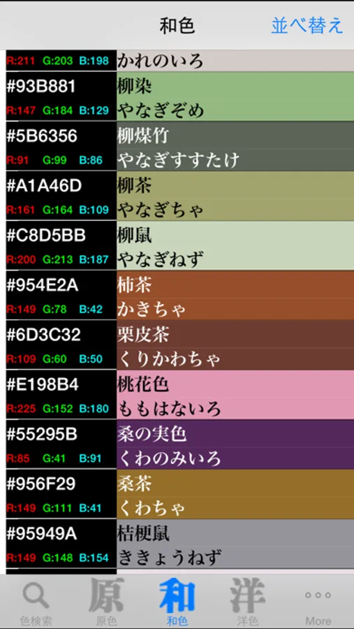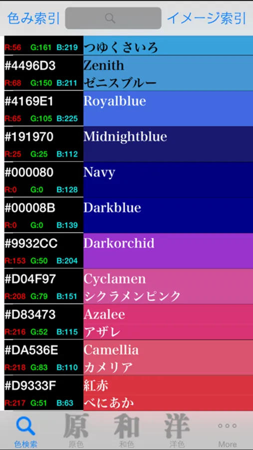 検索機能もあります、検索したい色の色名、カラーコード(16進数)、RGBコードを入力てください。