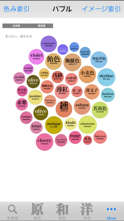 JIS規格「物体の色名」を中心とした日本の伝統色465色の色辞典です。伝統色名と16進数(近似値)が記載されています。日本の伝統色の色名辞典としても楽しめます。