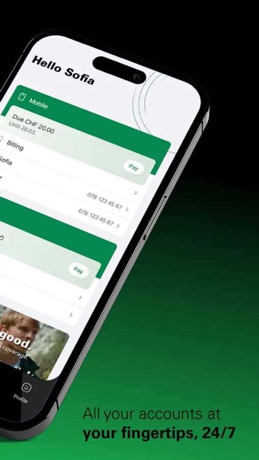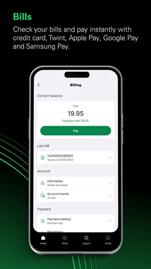 • Receive your latest bill and pay instantly with credit card, TWINT, Apple Pay, Google Pay and Samsung Pay.