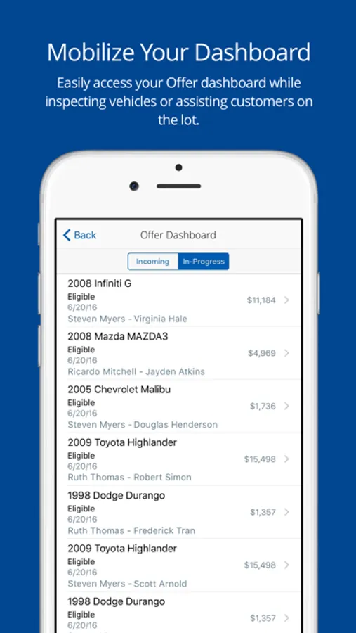 Participating Dealers can use this tool to conveniently generate and edit Offers for walk-in traffic and for existing inventory. Scan or enter the vehicle’s VIN and input its options and condition to generate an Instant Cash Offer. Once you have verified the car’s options and condition, the customer can sell their car to you or use the Offer toward the purchase of a new vehicle.
