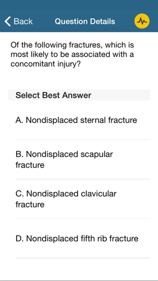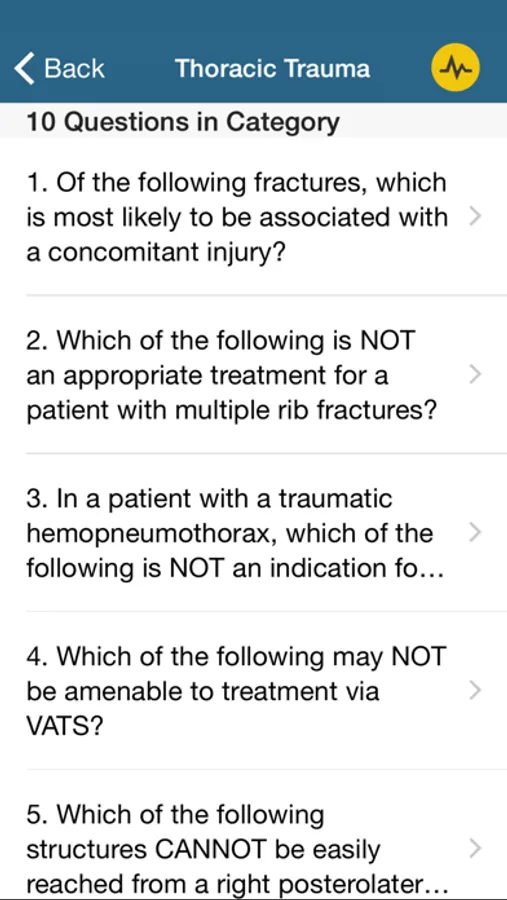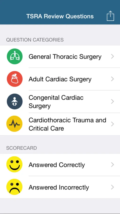 The Thoracic Surgery Residents Association (TSRA) is the organization that represents next generation of cardiothoracic surgeons. As such, the TSRA has assembled a catalog of educational materials for residents and fellows embarking on the arduous course of training. This app is the newest member of that catalog and allows the user to test their knowledge base by answering multiple choice questions in the major disciplines associated with thoracic surgery: adult cardiac surgery, congenital cardiac surgery, general thoracic surgery, and trauma and critical care. Each of the four disciplines is subdivided into important categories with approximately 10 questions per subject. The user selects the best answer and is immediately notified if their choice was correct. The notification contains the correct answer and, usually, an explanation for the correct answer and the incorrect options. Answered questions are stored on the device as either answered correctly or answered incorrectly, providing the user the opportunity to review their previous attempts. Questions can be reset to allow the user to repeat the questions as needed.